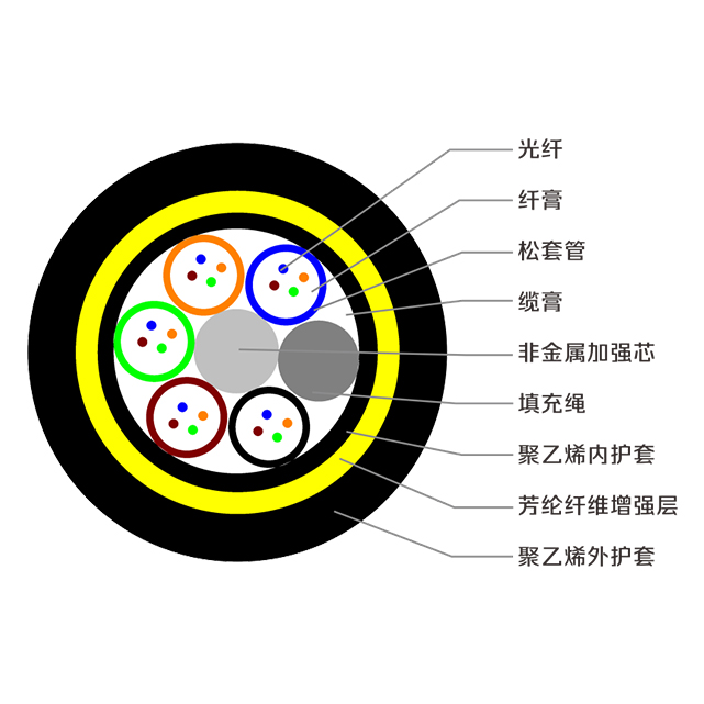 产品特性·专为电力系统设计,是一种全绝缘介质的自承式架空光缆,结构中不含任何金属材料。·全绝缘结构和较高的耐压指标,有利于在带电运行的架空电力线路上架设施工,不影响线路运行。·采用抗拉强度高的芳纶材料即能承受较强张力,满足架空电力线路的大跨距要求。