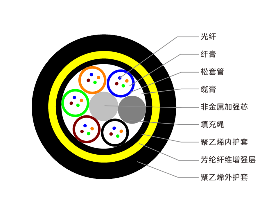 可作为OPGW系统中继站的引入和引出光缆使用,基于其安全属性,在引入和引出中继站时,可以很好地解决电力隔离问题;还可作为高压电力网中光纤通信系统的传输光缆。