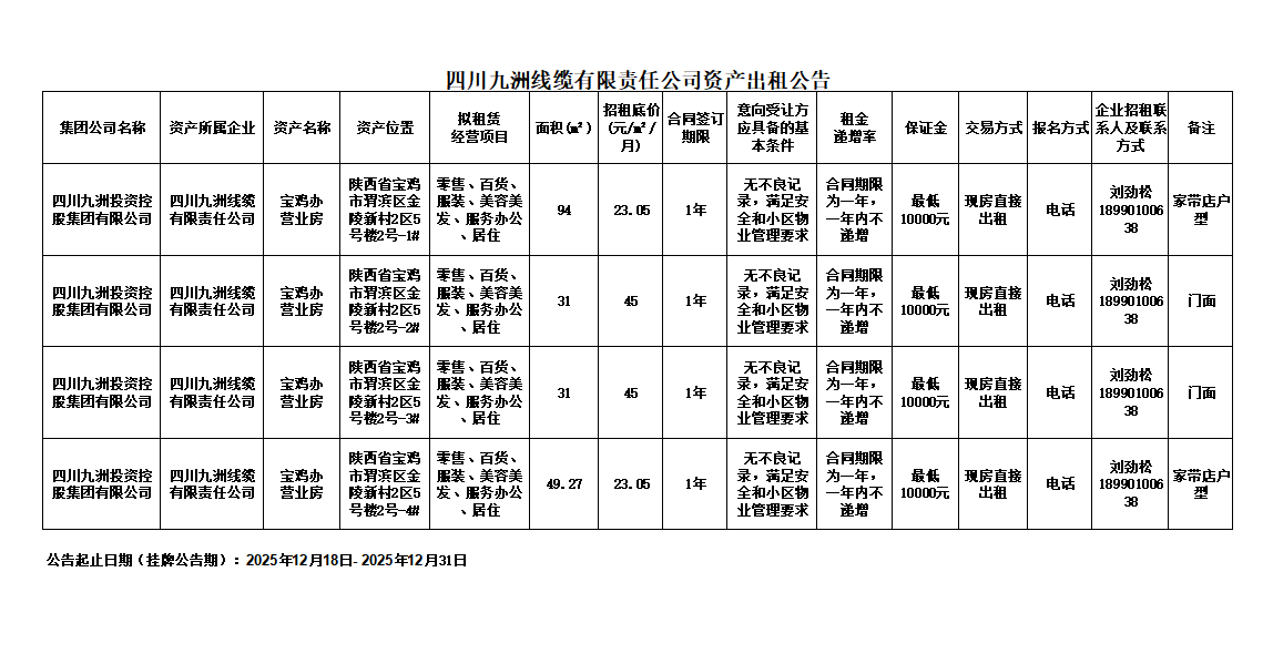 四川九洲线缆有限责任公司资产出租公告