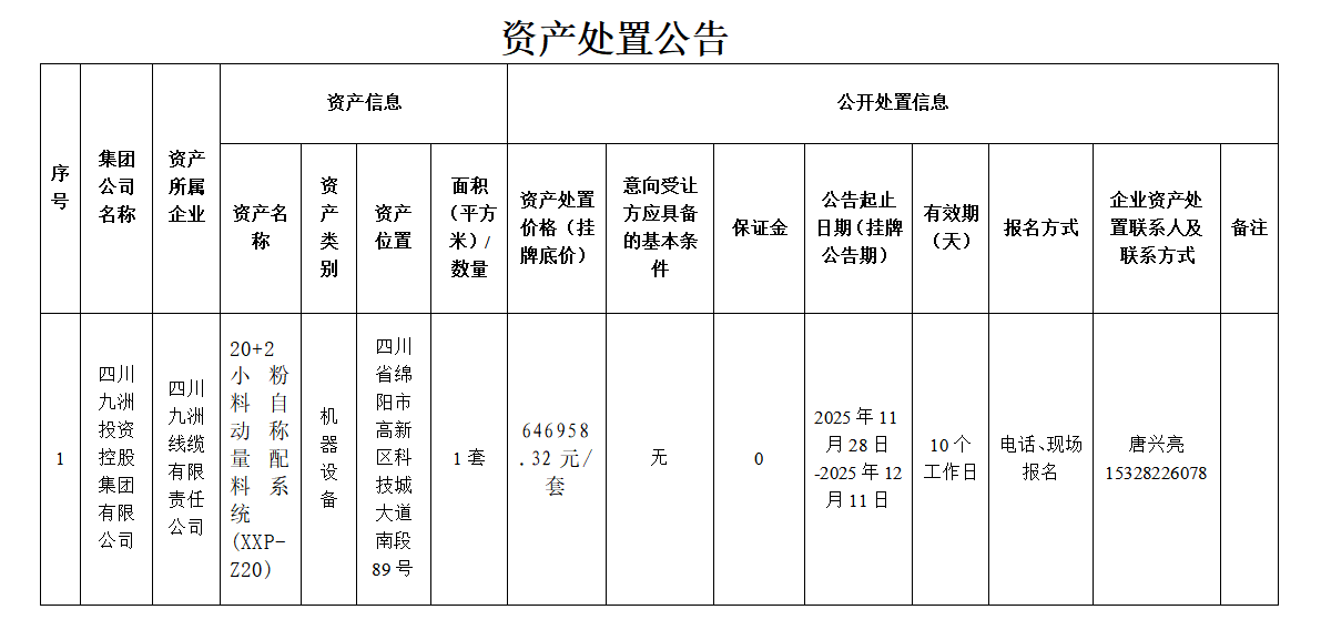 四川九洲线缆有限责任公司物理发泡生产设备资产处置公告